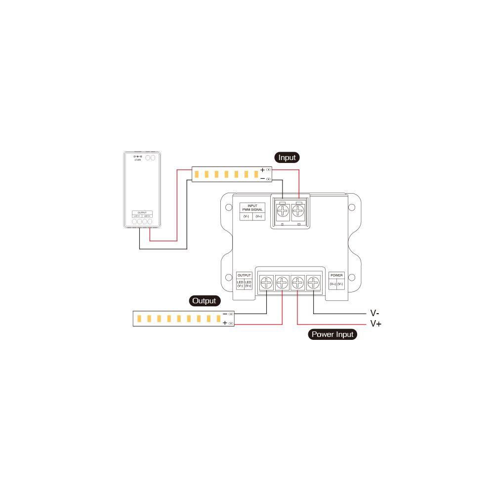 - Si la sortie du variateur ne fait que 72W et que l'on souhaite brancher un ruban de 144W, on connecte l'amplificateur directement à la sortie du contrôleur (en utilisant une alimentation de plus de 144W qui alimente le variateur + l'amplificateur.