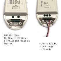 Le principe de montage est simple, l'alimentation se connecte au secteur en 230V. Le ruban se fixe à l'aide de son autocollant et peut être recoupé. Il possède 2 fils et se connecte selon le principe suivant en sortie de l'alimentation :